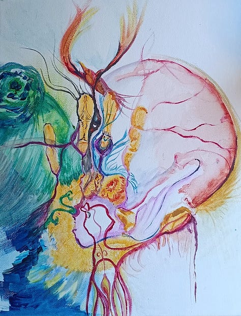 Then I paint. And let my hands and my inner vision do the very same job. This time not with words, but by giving form to the invisible processes working inside me mixed with the attunement of feeling into the “need” from the Field. ✨
