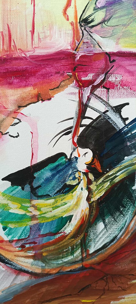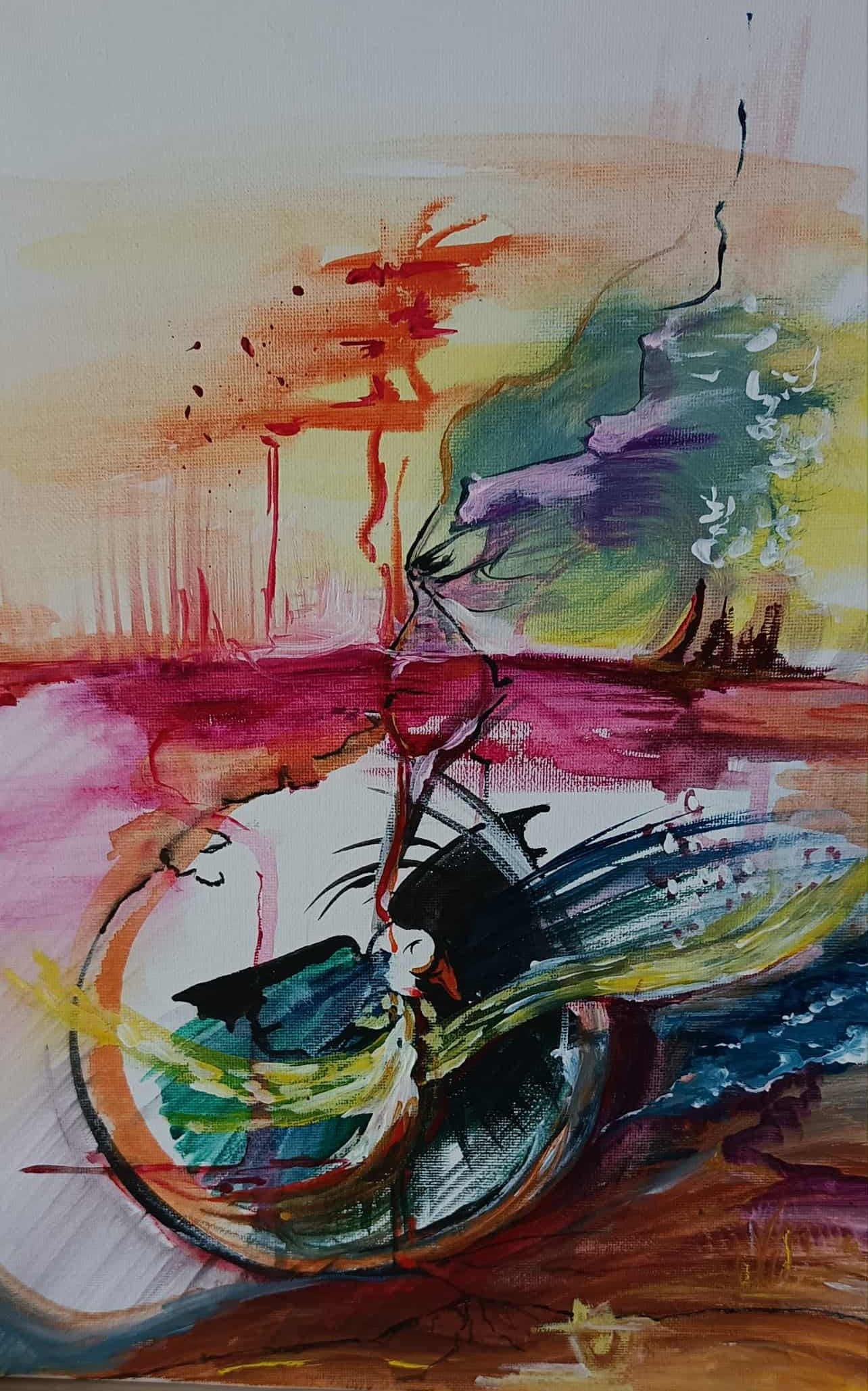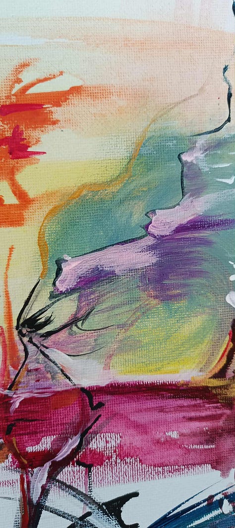 Make an unusual choice: a canvas (paper) size, which feels too big; a color, which normally scares you; painting with your own fingers and getting messy etc.