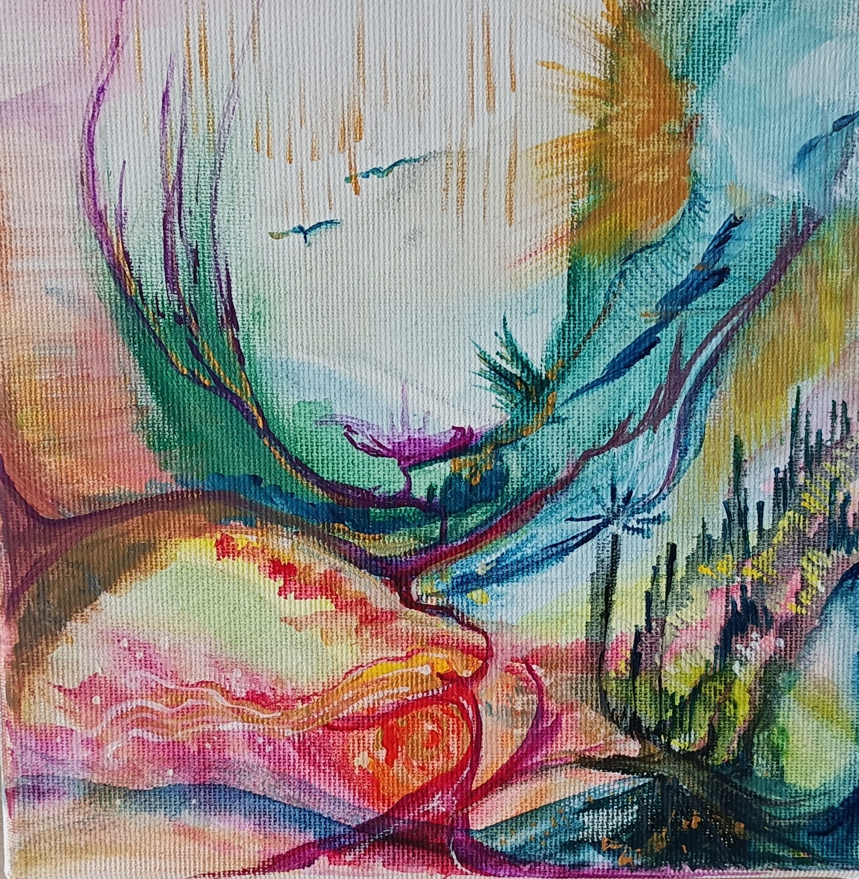 Tap into it and start your painting from whatever “form or movement” you can grasp. Maybe it is a wing of a bird, or a cave, or a light in a tunnel, a spiral or just some movement you can use with holding the pencil/brush…Bodily wisdom? Scan your body, feel into where you feel restricted or contracted? Do you experience pain somewhere? Are you bracing or holding tension? Which area of your body is in need of attention?